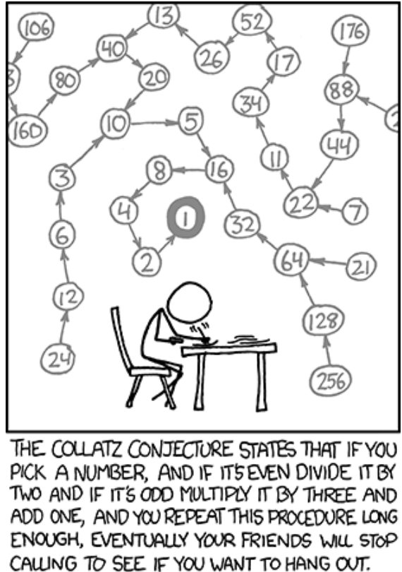 Vandaar dat we altijd stoppen als we uitkomen bij 1. Het vermoeden van Collatz is tot op heden een openstaand wiskundig probleem dat nog niemand heeft kunnen bewijzen, maar waar ook nog geen tegenvoorbeelden voor gevonden zijn.
