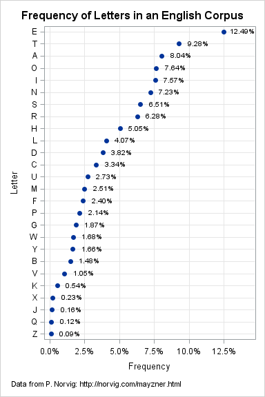 We zien dat sommige letters bijna uniek te identificeren zijn puur op basis van hun frequentie in een tekst. Als de tekst lang genoeg is, kunnen we een substitutiecijfer in het Engels dus kraken door de meest frequente letter af te beelden op E, de tweede meest frequente op T, enz. Dit werkt omdat alle substitutiecijfers als grote zwakte hebben dat ze elke letter altijd op dezelfde andere letter afbeelden en zo dus de frequenties van de originele letters intact houden.