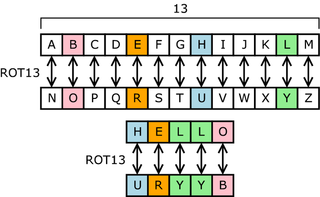 Een van de simpelste manieren om geheime boodschappen te schrijven, is via een substitutiecijfer. Hier zet je elke letter in het alfabet om naar een vaste andere letter. Een voorbeeld van een dergelijke cijfer is ROT13, dat alle letters van het alfabet 13 posities opschuift zoals in onderstaande afbeelding: